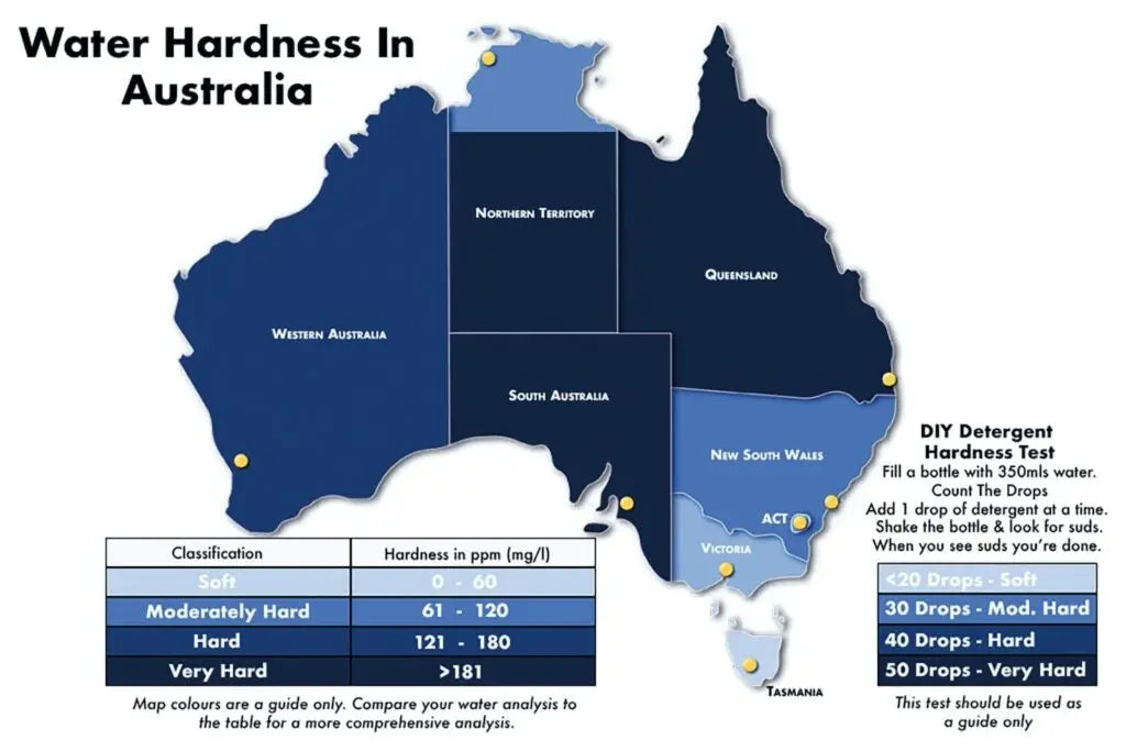 - Harder areas: Adelaide, parts of Brisbane, and northern Perth suburbs often exceed 130–200 mg/L.